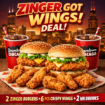 2 Zinger Burgers + 6Pcs Crispy Wings + 2 Nr Drinks